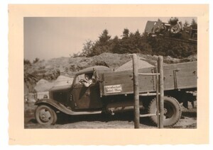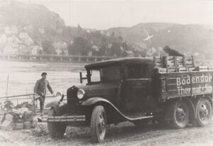 Schwarz-weiß Fotografie der Dorfstraße in den 1950er Jahren. Ein Lastkraftwagen fährt aus dem Dorf Richtung Bahnhof. Er befindet sich auf Höhe des Thomashofes. Die Stromversorgung der Häuser erfolgte zu dem Zeitpunkt noch mit an Holzmasten befestigten Leitungen. Ein Mast ist rechts vor dem Lastkraftwagen am Straßenrand zu erkennen.