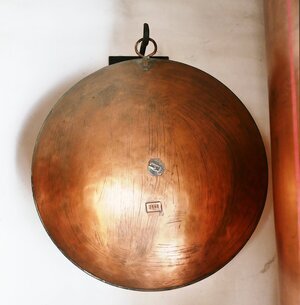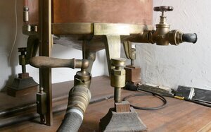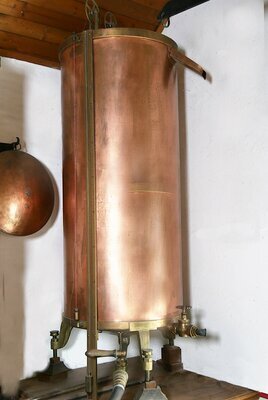 Kubizierapparate wurden meist zur Volumenbestimmung von Holzfässern eingesetzt. Die Holzfässer hatten fertigungsbedingt im Gegensatz zu den heute eingesetzten KEG-Fässern fast immer unterschiedliche Füllvolumina. Bei diesem Messgerät (korrekt Maßverkörperung) wurde der tatsächliche Messwert also erst bei der Eichung festgelegt. Die Vermessung der Fässer erfolgte entweder durch die Eichbehörden selbst, in den meisten Fällen jedoch durch einen örtlichen Fasseichmeister, der in den gemeindeeigenen Fasseichämtern tätig war. Üblicherweise erfolgte die Vermessung mit Kubizierapparten. Der große der 3 kupfarbenen Kubizierbehälter im Wiegehaus des Freilichtmuseums hat ein Fassungsvermögen von 400 Litern. Er ist aus Kupfer gefertigt und steht auf einem Ring mit 4 geschwungenen Füßen. Diese stehen nicht direkt auf dem Boden, sondern nutzen dazu eine exakt einstallbare Schraube mit der der Behälter exakt in der Senkrechte und Waagrechte austariert werden kann. Der Kubizierbehälter ist austariert, wenn ein Senkgewicht, das von der Decke des Behälters frei herunterhängt, über die am Boden befestigte Spitze gebracht wurde (siehe Abbildung). Der Behälter wird durch einen Anschluss für "fließendes Wasser" und einen dann offenen Wasserhahn mit Wasser befüllt. Ein Überlauf oben am Behälter garantiert, dass bei voller Füllung genau 400 Liter Wasser eingefüllt wurde. Danach wird durch einen mit einem Hahn öffenbaren Auslass das Fass, dessen Rauminhalt gemessen werden soll, mit Wasser gefüllt. Jetzt kann abgelesen werden wie viel Wasser im Behälter nach Füllen des Weinfasses fehlt. Dies geschieht bei diesem Kubizierbehälter folgendermaßen: Auf dem Wasser im Behälter schwimmt ein Schwimmer. Dieser befindet sich im Museum links vom Kubizierbehälter. Bei Gebrauch ist er mit einem Gewicht das außen in einer senkrechten Vertiefung auf dem Behälter läuft mit einem Draht fester Länge verbunden. Der Draht wird oben auf dem Behälter durch ein Rad umgelenkt. Je weniger Wasser im Behälter ist, desto höher hängt das Gewicht, je mehr Wasser im Behälter ist desto tiefer hängt es. Neben dem Gewicht befindet sich ein aus Messing gefertigter Maßstab. Seine Skala reicht von 0 (unten) bis 400 (oben). Leider ist dieser Mechanismus derzeit defekt. Der Zeiger des Gewichts zeigt an wie viel Wasser dem Behälter beim Befüllen des zu eichenden Fasses entnommen wurde. Punzen und Eichmarken: Maßstab oben: K B (bedeutet Königreich Bayern, bis 1918) darunter Liter 400 Oben ist auf dem Kubizierbehälter ein Schild des Herstellers angebracht. Gewicht: Auf dem Gewicht ist oben eine 2 und unten No23 eingeschlagen. Hintergrundinfo: Kubizieren ist ein heute nicht mehr gebräuchlicher Begriff aus der Mathematik und bedeutet die 3. Potenz - analog zum quadrieren als Begriff für die Errechnung der zweite Potenz. Der Kubizierbehälter ist der wesentliche Bestandteil eines Kubizierapparats zur Bestimmung des Rauminhalts eines Gefäßes. Die Prüfung (Eichung) der Kubizierapparate erfolgt(e) durch Auslitern mittels Eichkolben (quasi Messbecher) mit bekannten Volumina. Die Kubizierbehälter im Wiegehäuschen wurden zur Eichung von Weinfässern verwendet. Weinfässer wurden von meist ortsansässigen Küfern hergestellt und hatten meist nur ungefähr das gewünschte Fassungsvermögen. Kurfürst Jacob III. von Eltz führte an der Mosel im Jahre 1567 die Eich ein: das Normen von Wein und allen anderen Waren, die man mit Weinmaßen zu messen und verkaufen pflegte. Ab der 2. Hälfte des 19. Jahrhunderts veranlasste Preußen die Einrichtung von staatlich kontrollierten Eichstellen in den Moselgemeinden. Eichmeister wurden bestellt, um das Fassungsvermögen zu bestimmen. Der Vorgang, wurde Auslitern genannt und dauerte eine Stunde. Als Hilfsmittel standen dem Eichmeister Gussbehälter zur Verfügung, Zum Auslitern wurde Wasser verwendet. Beim Eichvorgang wurde das betroffene Fass aus einem Referenzbehälter über einen Schlauch befüllt. War das Fass bis unter das Spundloch voll, so wurde an einem Zählwerk oder an einem Maßstab des Referenzbehälters die aus diesem abgeflossene Menge festgestellt, und im Fasseichbuch zusammen mit dem Namen des Fassbesitzers notiert. Mit dem Aufdrücken der Eichdaten mittels Brenneisen auf den Fassboden war die amtliche Eichung abgeschlossen. Ab der Nachkriegszeit verdrängten immer mehr industriell und oft auch aus Metall hergestellte Fässer die lokal hergestellten Holzfässer. Da erstere nicht mehr individuell geeicht werden mussten, entfiel die Notwendigkeit lokaler Eichstellen. Im Zuge der Auflösung der meisten örtlichen Fasseichstellen in den späten 1960er Jahren kam auch dieser Messbehälter in den Besitz der ehemaligen Eichdirektion des Landes RLP in Bad Kreuznach und wurde von dieser unserem Museum als Geschenk überlassen. Der Kubizierbehälter stammt aus der Pfalz die bis 1945 zu Bayern (bis 1918 Königreich) gehörte. Daher die Eichmarken mit KB.