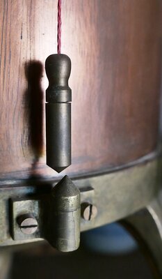 Kubizierapparate wurden meist zur Volumenbestimmung von Holzfässern eingesetzt. Die Holzfässer hatten fertigungsbedingt im Gegensatz zu den heute eingesetzten KEG-Fässern fast immer unterschiedliche Füllvolumina. Bei diesem Messgerät (korrekt Maßverkörperung) wurde der tatsächliche Messwert also erst bei der Eichung festgelegt. Die Vermessung der Fässer erfolgte entweder durch die Eichbehörden selbst, in den meisten Fällen jedoch durch einen örtlichen Fasseichmeister, der in den gemeindeeigenen Fasseichämtern tätig war. Üblicherweise erfolgte die Vermessung mit Kubizierapparten. Der mittlere der 3 kupfarbenen Kubizierbehälter im Wiegehäuschen des Freilichtmuseums hat ein Fassungsvermögen von 100 Litern. Er ist aus Kupfer gefertigt und steht auf einem Ring mit 4 geschwungenen Füßen. Diese stehen nicht direkt auf dem Boden, sondern nutzen dazu eine exakt einstallbare Schraube mit der der Behälter exakt in der Senkrechte und Waagrechte austariert werden kann. Der Kubizierbehälter ist austariert, wenn ein Senkgewicht, das von der Decke des Behälters frei herunterhängt, über die am Boden befestigte Spitze gebracht wurde (siehe Abbildung). Die Prüfung der Kubizierapparate selbst erfolgt(e) durch Auslitern mittels Eichkolben (quasi Messbecher) mit bekannten Volumina. Der Behälter wird durch einen Anschluss für "fließendes Wasser" und einen dann offenen Wasserhahn mit Wasser befüllt. Danach wird durch einen mit einem Hahn öffenbaren Auslass das Fass, dessen Rauminhalt gemessen werden soll, mit Wasser gefüllt. Ganz unten befindet sich ein Anschluss zum Ablassen des Wassers (in das zu eichende Fass). Oben ist ein Überlauf, der garantiert, dass nicht zu viel Wasser in den Behälter eingefüllt werden kann. Jetzt kann abgelesen werden wie viel Wasser im Behälter nach Füllen des Weinfasses fehlt. Dies geschieht folgendermaßen: Auf dem Wasser im Behälter schwimmt ein Schwimmer. Dieser befindet sich im Museum links vom Kubizierbehälter. Bei Gebrauch ist er mit einem Gewicht das außen in einer senkrechten Vertiefung auf dem Behälter läuft mit einem Draht fester Länge verbunden. Der Draht wird oben auf dem Behälter durch ein Rad umgelenkt. Je weniger Wasser im Behälter ist, desto höher hängt das Gewicht, je mehr desto tiefer hängt es. Neben dem Gewicht befindet sich ein aus Messing gefertigter Maßstab. Seine Skala reicht von 0 (unten) bis 90 (oben). Über der 90 sind noch Messstriche bis zu einem Wert von 100 angebracht. Sie zeigt an wie viel Wasser dem Behälter beim Befüllen des zu eichenden Fasses entnommen wurde. Eichmarken: Maßstab oben: F B 25 (bedeutet Freistaat Bayern, bis 1925 geeicht) Darunter: No 8 100 Liter bei völliger Entleerung Maßstab unten: F B (bedeutet Freistaat Bayern. Der Stempel wurde bis 1934 verwendet, danach auch hier D R ) Das Gewicht wurde getrennt vom Behälter geeicht und besitzt folgende Punzen: 25 D R im Wappenschild: 37 (25 ist der Code für den Aufischtsbezirkt Kusel, D R bedeutet: Deutsches Reich 37 bedeutet bis 1937 geeicht) No 7 / 37 (wohl eine fortlaufende Nummerierung) 494 g (Gewicht des Gewichts) Oben ist auf dem Kubizierbehälter ein Schild des Herstellers angebracht. Hintergrundinfo: Kubizieren ist ein heute nicht mehr gebräuchlicher Begriff aus der Mathematik und bedeutet die 3. Potenz - analog zum quadrieren als Begriff für die Errechnung der zweite Potenz. Der Kubizierbehälter ist der wesentliche Bestandteil eines Kubizierapparats zur Bestimmung des Rauminhalts eines Gefäßes. Die Kubizierbehälter im Wiegehäuschen wurden zur Eichung von Weinfässern verwendet. Weinfässer wurden von meist ortsansässigen Küfern hergestellt und hatten meist nur ungefähr das gewünschte Fassungsvermögen. Kurfürst Jacob III. von Eltz führte an der Mosel im Jahre 1567 die Eich ein: das Normen von Wein und allen anderen Waren, die man mit Weinmaßen zu messen und verkaufen pflegte. Ab der 2. Hälfte des 19. Jahrhunderts veranlasste Preußen die Einrichtung von staatlich kontrollierten Eichstellen in den Moselgemeinden. Eichmeister wurden bestellt, um das Fassungsvermögen zu bestimmen. Der Vorgang, wurde Auslitern genannt und dauerte eine Stunde. Als Hilfsmittel standen dem Eichmeister Gussbehälter zur Verfügung, Zum Auslitern wurde Wasser verwendet. Beim Eichvorgang wurde das betroffene Fass aus einem Referenzbehälter über einen Schlauch befüllt. War das Fass bis unter das Spundloch voll, so wurde an einem Zählwerk oder an einem Maßstab des Referenzbehälters die aus diesem abgeflossene Menge festgestellt, und im Fasseichbuch zusammen mit dem Namen des Fassbesitzers notiert. Mit dem Aufdrücken der Eichdaten mittels Brenneisen auf den Fassboden war die amtliche Eichung abgeschlossen. Ab der Nachkriegszeit verdrängten immer mehr industriell und oft auch aus Metall hergestellte Fässer die lokal hergestellten Holzfässer. Da erstere nicht mehr individuell geeicht werden mussten, entfiel die Notwendigkeit lokaler Eichstellen. Im Zuge der Auflösung der meisten örtlichen Fasseichstellen in den späten 1960er Jahren kam auch dieser Messbehälter in den Besitz der ehemaligen Eichdirektion des Landes RLP in Bad Kreuznach und wurde von dieser unserem Museum als Geschenk überlassen. Der Kubizierbehälter stammt aus der Pfalz die bis 1945 zu Bayern gehörte. Daher die Eichmarken mit FB.