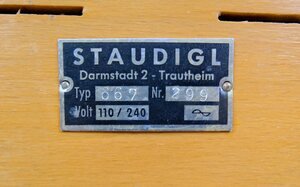 Bei unserem Objekt handelt es sich um ein Schulfunk Radio Modell 667 der Firma Staudigl, aus Darmstadt, aus den 1950er Jahren. Bei diesem Spezial-Schulfunkempfänger handelt es sich um ein transportables Tischgerät (auf jeder Seite ein Griff), verbaut in einem Holzchassis. Die wichtigsten Bedienelemente sind an der Vorderseite, unterhalb des Lautsprechers und der Senderscala, angebracht. Auf der der linken Seite sind es Stromanschluß 220V, 2 Lautsprecheranschlüsse mit Kippschalter ein/aus. Auf der rechten Seite gibt es 5 Drehschalter mit denen die Lautstärke, die Klangregelung, die Wellenbereiche UKW/MW/LW/KW und die Senderabstimmung eingestellt werden können. Auf der Rückseite sind die Eingänge für Micro und Tonband (jeweils mit 3 pol Diodenstecker), für Phono (Bananenstecker) sowie für Erde und Antennen. Vielen Dank an Herrnn R. Kautenburger aus Trierweiler, aus dessen Sammlung das Gerät stammt.