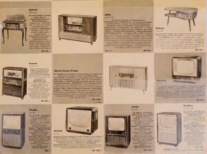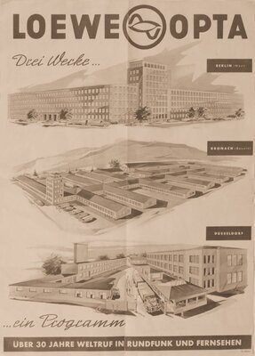 Auf der Vorderseite der DIA 0 Seite sind die 3 Werke von Loewe abgebildet. Berlin, Kronach und Düsseldorf. Auf der Rückseite ist das gesamte Produktionsprogramm aus den Jahren 1956/1957 abgebildet. Dazu gehören Tischradios, mit und ohne Plattenspieler, Musiktruhen sowie Fernseher, als Tisch bzw. Standgeräte. Zusätzlich sind ausführliche Angaben zur Technik, Ausstattungen und Preise der Geräte abgedruckt.