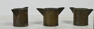 Bleikugelgewichtskännchen bzw. Kännchen für Tarierschrot für Apothekerwaagen. Drei Kännchen aus Metall (wahrscheinlich Messing) mit je einem Deckel in Trichterform und 2 Schnaupen. Dies ermöglichte ein leichtes Befüllen des Kännchens durch den Trichter mit dem kreisrunden Loch und ein feines Dosieren mittels der Schnaupen. Wurde zum Austarieren mechanischer Feinwaagen verwendet.