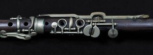 C-Klarinette, Fabrikat Mallach, Kaiserslautern Siegelgravur „Mallach Kaiserslautern“ zweimal am Instrument, bei Mundstück und bei Trichter