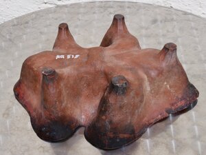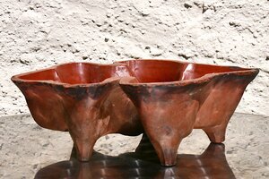 Backform aus feuerfester Keramik zum Backen eines kleinen Brots. Wahrscheinlich aus dem Elsass. Die Form ist innen rot glasiert. Außen hat der rötliche Ton mehrere schwarze Flecken. Die Form steht auch im Backofen auf vier Füßchen. Innen ist sie mit einer Bourbonenlilie verziert. Diese ist dann zugleich auch die Oberseite des gebackenen Brots.
