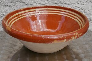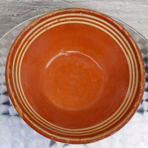 Einfache Schüssel aus Irdengut (unter dem Sinterpunkt gebrannte Keramik). Das Innere und der Rand der Schüssel sind rostrot glasiert. Im Inneren oben sind 3 als Schmuckelement 3 horizontale hellgelbe Streifen. Das unglasierte Äußere ist hellgraumit einigen etwas dunkleren Flecken.