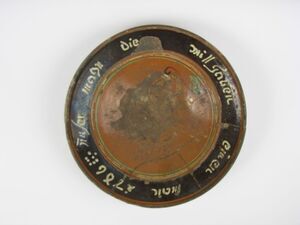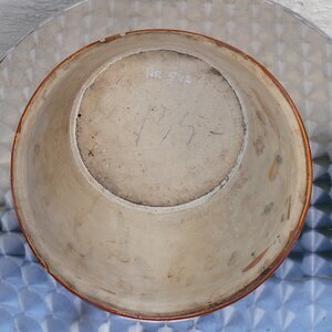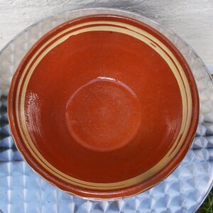 Einfache Schüssel aus Irdengut (unter dem Sinterpunkt gebrannte Keramik). Das Innere und der Rand der Schüssel sind rostrot glasiert. Im Inneren oben sind 3 als Schmuckelement 3 horizontale hellgelbe Streifen. Am verdickten Rand der Schüssel ist ein ebenso hellgelbes Schlangenband. Das unglasierte Äußere ist hellgraumit einigen etwas dunkleren Flecken.