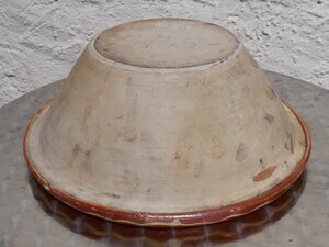 Einfache Schüssel aus Irdengut (unter dem Sinterpunkt gebrannte Keramik). Das Innere und der Rand der Schüssel sind rostrot glasiert. Im Inneren oben sind 3 als Schmuckelement 3 horizontale hellgelbe Streifen. Am verdickten Rand der Schüssel ist ein ebenso hellgelbes Schlangenband. Das unglasierte Äußere ist hellgraumit einigen etwas dunkleren Flecken.