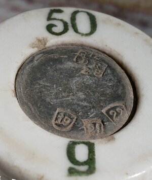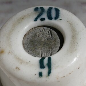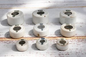 Neun Gewichte aus Porzellan: je 3 Gewichtstücke mit 100 g, 50 g und 20 g. Gewichte aus Porzellan wurden während und direkt nach dem Ersten Weltkrieg hergestellt, da auf Grund der Kriegswirtschaft ein Mangel an Metallen herrschte und sogar Gewichtssteine aus Metall für die Produktion von Kriegsgerät eingeschmolzen wurden. Die runden und säulenförmigen Gewichte sind aus weißem Porzellan gefertigt und haben oben eine Aufsparung in die zur Kalibrierung des Gewichts Blei eingegossen werden konnte. Porzellan verliert beim Brennvorgang Wasser und damit Gewicht. Deshalb kann das Endgewicht nicht mit der notwendigen Genauigkeit vorhergesagt werden und muss mit etwas Blei nachjustiert werden. Des weiteren bietet das Blei die Möglichkeit einen Eichstempel anzubringen. Allen Gewichten ist die Bleifüllung der Aussparung bei 7 Gewichte ist ein Eichstempel ist auf dem Blei vorhanden. Die erste Eichung der jeweiligen Gewichte fand 1916 (Gültigkeit bis 1918) statt. Vier Gewichte besitzen nur eine einzige Eichung, bei den anderen ist das jeweilige Gewicht mit mehreren Stempeln bis 1922 (3 Stempel), 1943 (4 lesbare und mehrere unlesbare Stempel), 1948 (3 lesbare und mehrere unlesbare Stempel) geeicht. Die Eichstempel sind - soweit lesbar - von verschiedenen Direktionen und vom Deutschen Reich (DR) und dem Königreich Bayern (KB).
