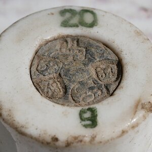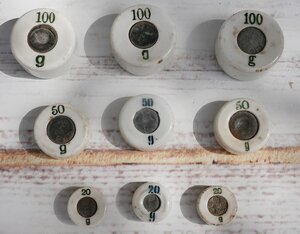 Neun Gewichte aus Porzellan: je 3 Gewichtstücke mit 100 g, 50 g und 20 g. Gewichte aus Porzellan wurden während und direkt nach dem Ersten Weltkrieg hergestellt, da auf Grund der Kriegswirtschaft ein Mangel an Metallen herrschte und sogar Gewichtssteine aus Metall für die Produktion von Kriegsgerät eingeschmolzen wurden. Die runden und säulenförmigen Gewichte sind aus weißem Porzellan gefertigt und haben oben eine Aufsparung in die zur Kalibrierung des Gewichts Blei eingegossen werden konnte. Porzellan verliert beim Brennvorgang Wasser und damit Gewicht. Deshalb kann das Endgewicht nicht mit der notwendigen Genauigkeit vorhergesagt werden und muss mit etwas Blei nachjustiert werden. Des weiteren bietet das Blei die Möglichkeit einen Eichstempel anzubringen. Allen Gewichten ist die Bleifüllung der Aussparung bei 7 Gewichte ist ein Eichstempel ist auf dem Blei vorhanden. Die erste Eichung der jeweiligen Gewichte fand 1916 (Gültigkeit bis 1918) statt. Vier Gewichte besitzen nur eine einzige Eichung, bei den anderen ist das jeweilige Gewicht mit mehreren Stempeln bis 1922 (3 Stempel), 1943 (4 lesbare und mehrere unlesbare Stempel), 1948 (3 lesbare und mehrere unlesbare Stempel) geeicht. Die Eichstempel sind - soweit lesbar - von verschiedenen Direktionen und vom Deutschen Reich (DR) und dem Königreich Bayern (KB).