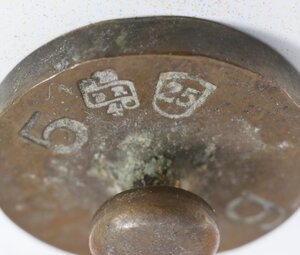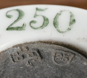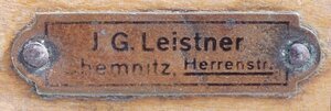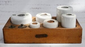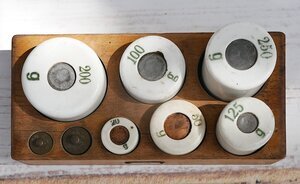 Gewichtssatz bestehend aus 6 Porzellangewichten und 2 kleinen Messinggewichten. Die Porzellangewichte wiegen 250 g, 200 g, 125 g, 100 g, 50 g, 20 g, die Messinggewichte wiegen 10 g und 5 g. 4 der Porzellangewichte besitzen noch die Bleifüllung aber nur das 250 g Gewicht besitzt noch ein Eichzeichen, das aber nicht mehr lesbar ist. Beide Messinggewichte sind bis 1925 geeicht. An der Frontseite befindet sich das Firmenschild "J.G. Leistner,m Chemnitz, Herrenstr." Die Hausnummer ist nicht mehr lesbar. Gewichte aus Porzellan wurden während und direkt nach dem Ersten Weltkrieg hergestellt, da auf Grund der Kriegswirtschaft ein Mangel an Metallen herrschte und sogar Gewichtssteine aus Metall für die Produktion von Kriegsgerät eingeschmolzen wurden. Die runden und säulenförmigen Gewichte sind aus weißem Porzellan gefertigt und haben oben eine Aufsparung in die zur Kalibrierung des Gewichts Blei eingegossen werden konnte. Porzellan verliert beim Brennvorgang Wasser und damit Gewicht. Deshalb kann das Endgewicht nicht mit der notwendigen Genauigkeit vorhergesagt werden und muss mit etwas Blei nachjustiert werden. Des weiteren bietet das Blei die Möglichkeit einen Eichstempel anzubringen. Allen Gewichten ist die Bleifüllung der Aussparung bei 7 Gewichte ist ein Eichstempel ist auf dem Blei vorhanden.