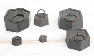 Sechs sechseckige, nach oben etwas schmaler werdende Gewichte aus Eisen. Auf jedem Gewicht steht die Gewichtsangabe. Mit einem Ring kann das Gewicht in die Hand genommen werden oder an einem Haken aufgehängt werden. Vorhandene Gewichte: ( Gewicht / Durchmesser / Höhe) 5 kg / 12 cm / 7 cm 2 kg / 8,5 cm / 5 cm 1 kg / 7 cm / 4 cm 500 g / 5,5 cm / 3 cm 100 g / 3 cm / 2 cm 50 g / 2,5 cm / 1,5 cm Sechseckige Gewichte deuten auf eine Herstellung in Frankreich. Auch die in Deutschland unübliche Beschriftung "KILOG" lässt dies vermuten.