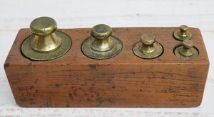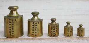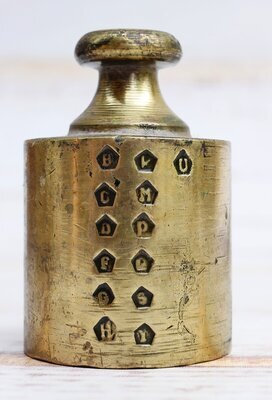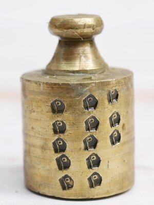 Gewichtssatz mit 5 Messinggewichten. Die Gewichte sind seitlich am Gewicht von oben nach unten in 2-3 Spalten mit französischen Eichzeichen (Punzen) versehen. Die Stempel mit Buchstaben stehen für die jeweiligen Jahre. Gewichtstücke hatten in Frankreich wohl auch eine Eichgültigkeit von einem Jahr. Diese sind ein je Buchstabencode für ein Jahr in einem Fünfeck. Die Eintragungen laufen von oben nach unten und bei Bedarf in mehreren Spalten Bei allen bis auf dem kleinsten Gewichtsstück Beginnen die Punzen mit B und Enden irgendwo im Alfabeth. Buchstaben werden auch ausgelassen. Jeweils letzter Buchstabe sind >Y, U, T und R.