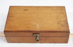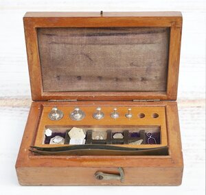 Kästchen zur Aufbewahrung von Gewichten für Feinwaagen mit Gewichtsstücken und Gewichtsplättchen. Das Kästchen ist aus Eichenholz und kann mit einem Drehverschluss verschlossen aber nicht abgesperrt werden. Im Inneren sind 5 Gewichte: 2 mit 10 g, 1 mit 5 g, eines mit 1 g, zwei 1 g -Gewichte fehlen. Unter einer herausnehmbaren Plexiglasabdeckung sind noch 8 Gewichtplättchen im Milligrammbereich. Ein 200 mg Plättchen besitzt ein Eichzeichen, das bis 1945 galt, ein anderes ein nicht mehr lesbares Eichzeichen. Der Stern im Eichzeichen zwischen D und R verdeutlicht, dass es sich um ein Gewicht für eine Präzisionswaage handelt. Die 22 weist auf den Eichaufsichtsbezirk Stuttgart hin. Das vorderste längliche Fach ist der Platz einer Pinzette.