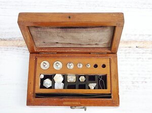 Kästchen zur Aufbewahrung von Gewichten für Feinwaagen mit Gewichtsstücken und Gewichtsplättchen. Das Kästchen ist aus Eichenholz und kann mit einem Drehverschluss verschlossen aber nicht abgesperrt werden. Im Inneren sind 5 Gewichte: 2 mit 10 g, 1 mit 5 g, eines mit 1 g, zwei 1 g -Gewichte fehlen. Unter einer herausnehmbaren Plexiglasabdeckung sind noch 8 Gewichtplättchen im Milligrammbereich. Ein 200 mg Plättchen besitzt ein Eichzeichen, das bis 1945 galt, ein anderes ein nicht mehr lesbares Eichzeichen. Der Stern im Eichzeichen zwischen D und R verdeutlicht, dass es sich um ein Gewicht für eine Präzisionswaage handelt. Die 22 weist auf den Eichaufsichtsbezirk Stuttgart hin. Das vorderste längliche Fach ist der Platz einer Pinzette.