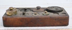 Gewichtssatz mit 8 Gewichten und zwei fehlenden Gewichten. Vorhanden sind: 1 200 g Gewicht aus Eisen mit Rand und Flugrost 1 100 g Gewicht aus Eisen und Flugros 1 50 g Gewicht aus .. Eichzeichen 26 / 15 Jahre für 1912 und 1931 1 50 g Gewicht aus Messing Eichzeichenjahre für 1952, 1954, 1956 1 20 g Gewicht aus Messing Eichzeichebjahr 1921 1 10 g Gewicht aus Messing Eichzeichenjahr 1915 1 5 g Gewicht aus Messing Eichzeichenjahr 1929 1 5 g Gewicht aus Messing 2 leere Aussparungen für noch kleinere Gewichte Weitere Eichzeichen sind entweder entstempelt oder auch nur so nicht mehr lesbar Da die Gewichtsstücke aus verschiedenen "Epochen" stammen sind es wohl zumindest teilweise nicht die originalen Gewichtsstücke