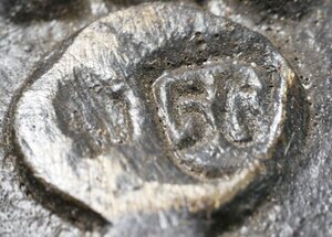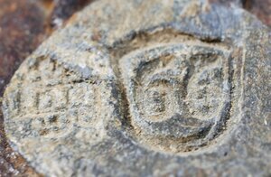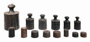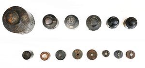 14 Gewichtssteine aus Eisen unterschiedlicher Herkunft - meist mit Flugrost. Gewichte: Obere Reihe 5 kg, 1 kg, 1 kg, 2 ZPF, 0,5 kg, 0,5 kg 2mal 100g, 1mal 125g, 3mal 200g, 2mal 250g 10 Steine besitzen (Rest von) in aufgetragenem Blei gestempelte Eichstempel. Nur bei zwei von diesen lässt sich überhaupt noch irgend etwas erkennen (siehe Abbildungen).