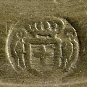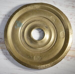 Rosette aus Messing. Möglicherweise Teil und unterstes Gewicht eines Gewichtsstapels. DIe Oberseite ist mit Ringen profiliert und mit wulstigem Rand, Unterseite glatt. Die Oberseite hat eine Stelle mit Grünspahn und 3 Punzen: Die Jahresangaben 1914 und 1915 sowie ein Wappenschild mit einem Kreuz, links und Rechts davon ein Mensch (oder ein Riese) und darüber eine Krone. Leider war das Wappen in der einschlägigen Literatur nicht zu identifizieren.