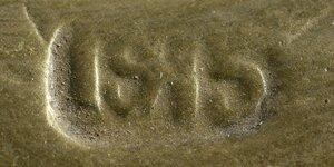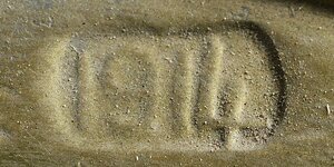 Rosette aus Messing. Möglicherweise Teil und unterstes Gewicht eines Gewichtsstapels. DIe Oberseite ist mit Ringen profiliert und mit wulstigem Rand, Unterseite glatt. Die Oberseite hat eine Stelle mit Grünspahn und 3 Punzen: Die Jahresangaben 1914 und 1915 sowie ein Wappenschild mit einem Kreuz, links und Rechts davon ein Mensch (oder ein Riese) und darüber eine Krone. Leider war das Wappen in der einschlägigen Literatur nicht zu identifizieren.