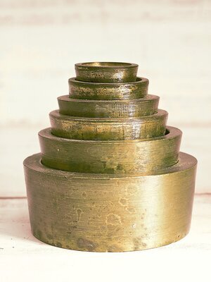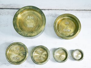 Sechs Bechergewichte zur Verwendung bei Apothekerwaagen oder z.B. auch französischen Postwaagen für Briefe und leichte Postsendungen. Die 6 Gewichtsstücke in Daten: Durchmesser: 1,5 cm Höhe: 0,5 cm Gewicht: 10 g Durchmesser: 20 cm Höhe: 0,5 cm Gewicht: 20 g Durchmesser: 3 cm Höhe: 0,5 cm Gewicht: 30 g Durchmesser: 3,5 cm Höhe: 1 cm Gewicht: 60 g Durchmesser: 4 cm Höhe: 1,5 cm Gewicht: 120 g Durchmesser: 5 cm Höhe: 2 cm Gewicht: 250 g Aufgrund der Abkürzung Grm (für Gramm) ist die Herkunft aus Frankreich wahrscheinlich.