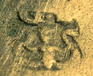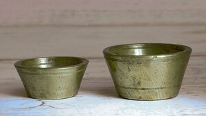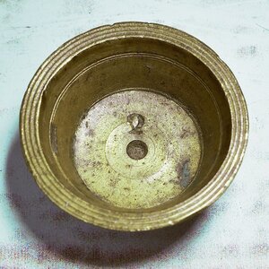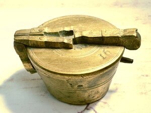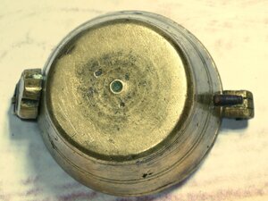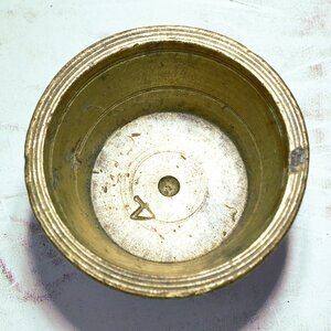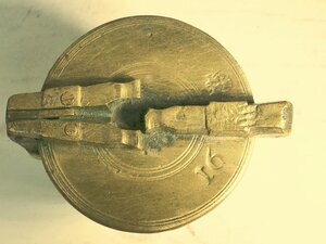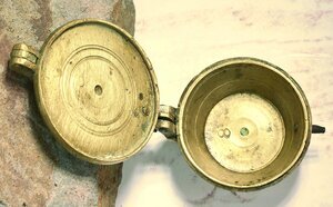 Behälter für Bechergewichte. Der Stift mit dem der Deckel verschlossen werden konnte ist abgängig. Innen auf dem Boden befindet sich die Zahl 8. Auf dem Decke befindet sich die Zahl 16, eine Punze mit einer schlecht erkennbaren Meerjungfrau und mehrere kreisförmige Rillen. Sucht man in Schnieder (2015) nach Meerjungfrau-Marken ohne weitere Zusätze, so kämen hier die Gewichtehersteller Christoph Schön (Meerjungfraulogo 1728-1730), Martin Christoph Schön (Meerjungfraulogo 1787-1793), und Johann Jakob Spachtel (Meerjungfraulogo ab 1796) in Frage. Aussen Boden des größeren Gewichts befindet sich der Buchstabe N, innen die Zahl 4. Maße: Durchmesser: 3,5 cm, Höhe 2 cm Innen am Boden des keineren Gewichts befindet sich die Zahl 2. Maße: Durchmesser: 3,0 cm, Höhe 21,5cm Der Behälter beinhaltete früher wohl noch weitere Bechergewichte, die aber leider verloren gegangen sind.