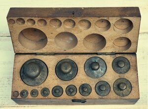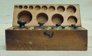 Rechteckiges Gewichtskästchen aus Eichenholz mit Deckel. Vorne befindet sich ein Verschlusshaken. Der Kasten enthält in filzunterlegten Vertiefungen für 13 Ausgleichsgewichte zwischen 1 kg und 2g. Eine Aussparung war wohl für ein 1 g Gewicht vorgesehen, das leider abgängig ist. Im Deckel sind Aussparungen für die Köpfe der Gewichte vorhanden. Es sind folgende Gewichte vorhanden: 1 kg, 500 g, 200 g, 100g, 100 g,20 g,. 10 g, 10 g, 5 g, 2 g, 2 g