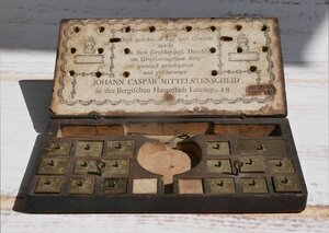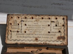 Der Geldwechslerkasten besteht aus einer Lade aus schwarz gebeiztem Holz. Die Lade kann mit Verschlusshaken wie sie Joh. Caspar Mittelscheid nach 1803 verwendet hat, geschlossen werden. In der Lade befinden sich in eingelassenen Vertiefungen eine Münzwaage mit 2 Schalen einem Waagebalken, einen um Falle des Gleichgewichts nach oben zeigenden Zeiger, 16 quadratische Gewichtsstücke mit je einem Griffstäbchen in und (noch) fünf Gewichtsplättchen in einer durch eine Klappe verschließbaren Vertiefung. Zwei für Gewichtsstücke vorgesehene Vertiefungen sind leer. Die Gewichtsstücke zeigen in der Ecke rechts oben eine Punze mit dem Bergischen Löwen. Unten ist eine Punze mit der Währung und links oben ist die Anzahl der Währungseinheiten punziert. Auflistung der Gewichtsstücke: 1 B.C. RONT 1 CRON,T (vielleicht ein Bezug auf die historische Britische Münze Crown ?) 1 DUCAT ( Dukat Goldmünze, die in ganz Europa einschließlich der Länder rund um das Mittelmeer bis zum Anfang des 20. Jahrhunderts umlief. Er besitzt einen Feingehalt von 986/1000 und wiegt ungefähr 3,49 g ) 2 DUCAT 5 FRANC (Französische Währung - seit 1795 einheitliche dezimal unterteilte Währung ) 10 FRANC 20 FRANC ( 2 Stück) 1 GINEE ( war eine von 1663 bis 1816 in Umlauf befindliche britische Goldmünze) 1 MAXD 1 PISTOL (Eine Pistole war eine spanische Geldmünze aus amerikanischem Gold, ab 1640 auch in Frankreich und Genua und in einigen deutschen Staaten gebräuchlich. 1857 abgeschafft) 2 PISTOL 1/2 SEVER 1 SEVER ------------------- ohne den Löwen ---------- 2 Ls.DOR - oben: N S ( Louis d’or eine französische Goldmünze, die in verschiedenen Variationen bon 1640 bis 1793 geprägt wurde) ( 2 Stück) Die Gewichtsplättechen besitzen eingeprägte Symbole (mit einer Ausnahme konzentrische Ringe). Die Anzahl der jeweiligen Symbold auf einem Blättchen bezeichnet dessen Gewicht. Sie wurden benutzt um die den Grad der Abweichung einer Münze von ihrem offiziellen Gewicht festzustellen. Da unter den 16 Gewichtsstücken französische 20 Franc 10 Franc und 5 Franc Münzen und für diese passgenaue Aussparungen vorhanden sind und diese erst ab 1803 in diesen Geldwechslerkästen vorgehalten wurden kann diese Lade nicht vor 1803 gebaut worden sein. An der Unterseite des Deckels ist ein Etikett eingeklebt. Zwischen Zierelementen wir umlaufenden Bändern ist auf diesem der folgende Text zu lesen: Diese geächte Waag und Gewicht macht In Ihro Grossherzogl. Durchl. im Grossherzogtum Berg gnädigst privilegirter und geschworener JOHJANN CASPAR MITTELSTENSCHEID in der Bergischen Hauptstadt Lennep, 18. Weiterhin ist dort ein Brandstempel mit den Buchstaben TTSTIRT und darüber die drei Kölner Kronen. Dieses und der Text beziehen sich auf das Großherzogtum Berg das bis 1815 existierte. Johann Caspar Mittelstenscheid verwendete diese Etiketten auch noch nach 1915 bis zu seinem Tod 1819, sodass sich die Entstehung dieses Kastens auf den Bereich 1803 bis 1819 eingrenzen lässt. Im länglichen hinteren Fach ist die Balkenwaage untergebracht. Ihre Waagschalen liegen in einer runden Aussparung in der Mitte. (Länge 16 cm, Breite 0,5 cm, Höhe 7,5 cm) Wir bedanken uns bei Herrn Rigobert Biehl vom Landesamt für Mess- und Eichwesen Rheinland-Pfalz für die Unterstützung bei der Inventarisierung dieses Objekts.