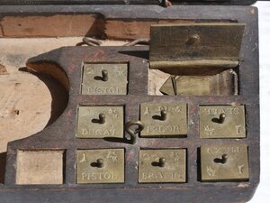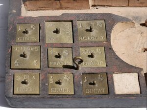 Der Geldwechslerkasten besteht aus einer Lade aus schwarz gebeiztem Holz. Die Lade kann mit Verschlusshaken wie sie Joh. Caspar Mittelscheid nach 1803 verwendet hat, geschlossen werden. In der Lade befinden sich in eingelassenen Vertiefungen eine Münzwaage mit 2 Schalen einem Waagebalken, einen um Falle des Gleichgewichts nach oben zeigenden Zeiger, 16 quadratische Gewichtsstücke mit je einem Griffstäbchen in und (noch) fünf Gewichtsplättchen in einer durch eine Klappe verschließbaren Vertiefung. Zwei für Gewichtsstücke vorgesehene Vertiefungen sind leer. Die Gewichtsstücke zeigen in der Ecke rechts oben eine Punze mit dem Bergischen Löwen. Unten ist eine Punze mit der Währung und links oben ist die Anzahl der Währungseinheiten punziert. Auflistung der Gewichtsstücke: 1 B.C. RONT 1 CRON,T (vielleicht ein Bezug auf die historische Britische Münze Crown ?) 1 DUCAT ( Dukat Goldmünze, die in ganz Europa einschließlich der Länder rund um das Mittelmeer bis zum Anfang des 20. Jahrhunderts umlief. Er besitzt einen Feingehalt von 986/1000 und wiegt ungefähr 3,49 g ) 2 DUCAT 5 FRANC (Französische Währung - seit 1795 einheitliche dezimal unterteilte Währung ) 10 FRANC 20 FRANC ( 2 Stück) 1 GINEE ( war eine von 1663 bis 1816 in Umlauf befindliche britische Goldmünze) 1 MAXD 1 PISTOL (Eine Pistole war eine spanische Geldmünze aus amerikanischem Gold, ab 1640 auch in Frankreich und Genua und in einigen deutschen Staaten gebräuchlich. 1857 abgeschafft) 2 PISTOL 1/2 SEVER 1 SEVER ------------------- ohne den Löwen ---------- 2 Ls.DOR - oben: N S ( Louis d’or eine französische Goldmünze, die in verschiedenen Variationen bon 1640 bis 1793 geprägt wurde) ( 2 Stück) Die Gewichtsplättechen besitzen eingeprägte Symbole (mit einer Ausnahme konzentrische Ringe). Die Anzahl der jeweiligen Symbold auf einem Blättchen bezeichnet dessen Gewicht. Sie wurden benutzt um die den Grad der Abweichung einer Münze von ihrem offiziellen Gewicht festzustellen. Da unter den 16 Gewichtsstücken französische 20 Franc 10 Franc und 5 Franc Münzen und für diese passgenaue Aussparungen vorhanden sind und diese erst ab 1803 in diesen Geldwechslerkästen vorgehalten wurden kann diese Lade nicht vor 1803 gebaut worden sein. An der Unterseite des Deckels ist ein Etikett eingeklebt. Zwischen Zierelementen wir umlaufenden Bändern ist auf diesem der folgende Text zu lesen: Diese geächte Waag und Gewicht macht In Ihro Grossherzogl. Durchl. im Grossherzogtum Berg gnädigst privilegirter und geschworener JOHJANN CASPAR MITTELSTENSCHEID in der Bergischen Hauptstadt Lennep, 18. Weiterhin ist dort ein Brandstempel mit den Buchstaben TTSTIRT und darüber die drei Kölner Kronen. Dieses und der Text beziehen sich auf das Großherzogtum Berg das bis 1815 existierte. Johann Caspar Mittelstenscheid verwendete diese Etiketten auch noch nach 1915 bis zu seinem Tod 1819, sodass sich die Entstehung dieses Kastens auf den Bereich 1803 bis 1819 eingrenzen lässt. Im länglichen hinteren Fach ist die Balkenwaage untergebracht. Ihre Waagschalen liegen in einer runden Aussparung in der Mitte. (Länge 16 cm, Breite 0,5 cm, Höhe 7,5 cm) Wir bedanken uns bei Herrn Rigobert Biehl vom Landesamt für Mess- und Eichwesen Rheinland-Pfalz für die Unterstützung bei der Inventarisierung dieses Objekts.