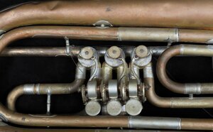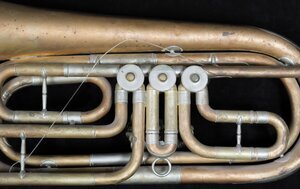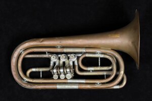 Basstrompete in B, gefertigt in der Instrumentenfabrik Zöphel & Kohlmann in Kaiserslautern. Die Fabrik wurde 1908 gegründet. Am Trichter kann man noch die Gravur "Zöphel & Kohlmann Kaiserslautern" erkennen.
