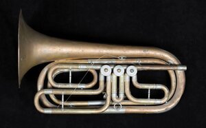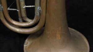 Basstrompete in B, gefertigt in der Instrumentenfabrik Zöphel & Kohlmann in Kaiserslautern. Die Fabrik wurde 1908 gegründet. Am Trichter kann man noch die Gravur "Zöphel & Kohlmann Kaiserslautern" erkennen.