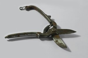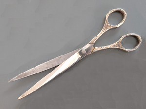 Die Griffe der Schere sind aufwendig gestaltet und verleihen ihr ein elegantes Aussehen. Die Klingen sind lang und spitz zulaufend. Es ist ein sichtbarer Drehpunkt vorhanden, an dem die Klingen miteinander verbunden sind, was die Öffnungs- und Schließbewegung der Schere ermöglicht. Die Farbgebung insgesamt besteht aus metallischen Tönen, wobei Schatten die Kurven und Designs auf den Griffen hervorheben.