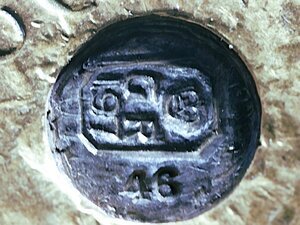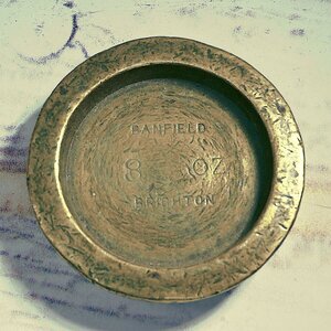 Ein englisches Gewichtsstück aus einem Gewichtsstapel. Flaches Gewichtsstück aus Messing mit sehr deutlichem Rand. Auf der Vorderseite sind folgende Inschriften zu finden: BANFIELD (wohl der Name des Herstellers) 8 OZ (8 unzen = 226,72 g) BRIGHTON (wohl der Firmensitz) Auf Rückseitseite steht die Inschrift COW (Bedeutung unklar) In der Justiermulde (die runde Aussparung in der Mitte) wurde Blei eingegossen. In diese wurde - nachdem das Gewicht durch Bleieintrag justiert wurde - eine Eichmarke gedrückt. Sie zeigt oben eine Krone, unten die Zahl 9 und dazwischen mit etwas Fantasie die Buchstaben G und R. Rechts von der Eichmarke ist um 90° gedreht die Zahl 46 zu sehen.