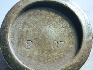 Ein englisches Gewichtsstück aus einem Gewichtsstapel. Flaches Gewichtsstück aus Messing mit sehr deutlichem Rand. Auf der Vorderseite sind folgende Inschriften zu finden: BAN + .. LT(wohl der Name des Herstellers) 2 OZ (8 unzen = 05,58 g) Auf Rückseitseite befindet sich die Inschrift 31 In die Justiermulde - die runden Aussparung in der Mitte - ist leer. In diese konnte Blei zur Kalibrierung des Gewichts eingegossen werden, das dann mit einer Eichmarke gestempelt wurde.