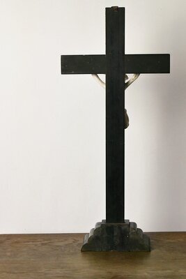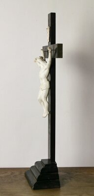 Das schwarze Standkreuz (Kruzifix) im Stil des Historismus steht auf einem schwarzen mit 5 Stufen abgetrepptem Sockel. Der Korpus ist aus Biscuit-Porzellan und weiß lackiert. Die Arme sind schräg nach oben ausgestreckt. Der weiße Korpus ist mit 2 Nägeln durch die nach oben gestreckten Hände am Querbalken befestigt Keine Seitenwunde. Der Nagel durch den linken Fuß, der den Korpus am Längsbalken fixierte, ist abgängig. Oberhalb des Kopfes befindet sich der Titulus crucis (die INRI-Tafel) in Form eines römischen Feldzeichens. Auf diesem sind die Buchstaben IN RI in zwei Zeilen geschrieben. Unter den Füßen ist ein Nagelloch im Holz des Kreuzes. Es kann stark vermutet werden, dass hier ursprünglich eine heute abgängige Totenkopfdarstellung des Adamsschädels befestigt war. Die schwarz lackierten Holzkreuze fanden wohl vor allem bei der häuslichen Totenaufbahrung Verwendung.