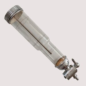 Kastenförmiger Blechbehälter mit Innentank und Glasylinder mit Maßskala auf der Vorderseite. Der Glaszylinder wird unten am Tank aufgeschraubt Ein Ersatzzylinder für die Abfüllanlage sind vorhanden. Das Objekt ist als Tafelölabfüller beschriftet. Er kann auch für andere im Haushalt benötigte Flüssigkeiten, wie Essig oder Rüböl, verwendet werden. Der Abfüller besteht aus einer Vorderseitigen Oberfläche in silberfarbenem Metall. Die Seiten und Rückwand aus unlackiertem Metall. Oben ist ein Deckel, über den die Flüssigkeit aufgefüllt werden und eine Klappe, über die man den Füllstand in den Innentank schauen kann. Ein Schild mit dem Wort “Tafelöl” weist auf den Inhalt im Tank hin. Unterhalb des Schildes befindet sich ein transparenter Glaszylinder mit der Maßangabe 1/1, 1/2, 3/4 und 1 Liter, der die Flüssigkeit enthält. Am unteren Ende des Zylinders ist ein Hahn, um die Flüssigkeit abzufüllen. Der Boden unter dem Spender sieht abgenutzt und fleckig aus, was auf häufigen Gebrauch hindeutet. Ein Ersatzabfüllglas ist vorhanden.