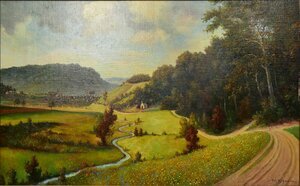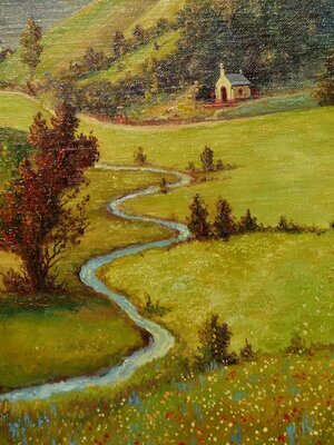 Gemälde "Konzer Tälchen" von Johann Hoffmann (Konz). Das Bild ist technisch Öl auf Malkarton und zeigt den unteren Teil des Konzer Tälchens. Der Standpunkt des Malers ist etwa in der Mitte zwischen der Jeuchenkapelle und dem Gut Falkenstein. Etwa bei LAT 49.6939 LON 6.5948 (Bild 8), oder bei LAT 49.6920 , LON 6.6023 (Bild 9) oder irgendwo dazwischen. Im Vordergrund schlängelt sich der Konzer Bach durch die Wiesen. Darüber ist die damalige Straße von Konz in das Konzer Tälchen zu erkennen. Im Mittelgrund steht die Jeuchenkapelle. Links über dieser sind die Weinberge der Lage "Am Sprung" zu erkennen. Hinter den Weinbergen steht an der Hangkante das Haus "Am Sprung". Links von diesem liegt Konz wovon der obere Ortsteil sichtbar ist. Links im Ort ist die Kirche St. Nikolaus. Das auffällige Gebäude rechts ist woh der Phantasie des Malers entsprungen. Der Hügel hinter und über dem Ort ist der Rosenberg mit dem Orchideengebiet Perfeist. Der breite Fahrweg wurde etwas angepaßt und geteert. Die beiden rechts in den Wald abzweigenden Wege werden noch als Wanderwege genutzt und werden ebenfalls noch von der Forstwirtschaft befahren. Der Abzweig zum Schützenhaus und dann zum Roscheider - Neubaugebiet ist hier nur andeutungsweise zu sehen, aber das entspricht heute noch der Realität. Da wurde nach den Stürmen 90/91 ein Holzlagerplatz anglegt der heute als Wanderparkplatz dient. Der Zustand des Tals hat sich seither sehr verändert: Heute ist fast der ganze Talgrund mit Bäumen und Büschen zugewachsen, sodass man von dieser Stelle keinen freien Blick mehr hat. Das auf dem Bild sichtbare Sträßchen wurde asphaltiert, ist aber - außer für Anlieger - für den motorisierten Verkehr gesperrt. Die Straße ins Konzer Tälchen läuft heute auf der anderen Talseite. Links vom Aufnahmestandpunkt befinden sich Fischweiher des Konzer Angelsportvereins. Die Weinberge links von der Kapelle wurden um die Jahrtausendwende aufgegeben und sind heute mit ausgesamten Bäumen bewaldet. Die bewaldete Kuppe über der Kapelle ist heute ein Teil des Wohngebiets Konz-Roscheid. Die alte Konzer Kirche links wurde um 1958 abgerissen und 1959 bis 1961 durch eine Betonkonstruktion ersetzt. Links von der Kirche am Hang entlang befindet sich heute das Wohngebiet Konz-Kanet. Der auffällige Bau etwas rechts in Konz war die ehemalige katholische Volksschule (später Hauptschule) und wurde Anfang der 2000er Jahre abgerissen. Auch in Richtdung Konzer Tälchen hat sich die Bebauung ausgedehnt. Hier steht im Talgrund das Hallenbad und links am (flachen) Hang das Konzer Schulzentrum. Eine gewisse Herausforderung ist es heute (2024) den Standpunkt des Malers zu finden. Links und rechts des Weges ist alles zugewachsen, sodass man den Standpunkt nur aufgrund der geschätzten Entfernung zur Kapelle, den Kurven des Weges (der sich durch die Anlage der Fischteiche verändert hat) und den einmündenden Wegen bestimmen kann. Am ehesten kommen hier die Fotos Nr. 8 und Nr. 9 in Frage. Bei ersterem passen die einmündenden Seitenwege, aber der Platz liegt etwas zu nahe an der Kapelle, bei letzterem ist der Abstand fast etwas zu groß und ein Seitenweg müsste verschwunden sein ...