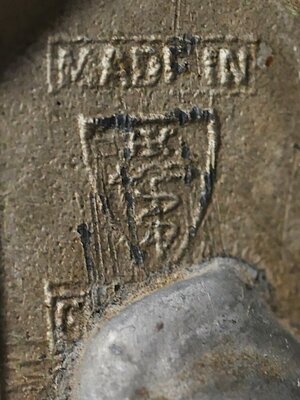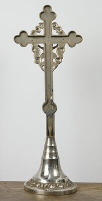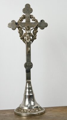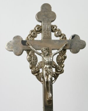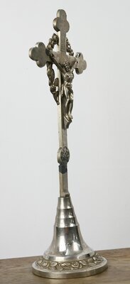 Verilbertes Standkreuz (Kruzifix). Dreinageltyp. An einigen Stellen Abplatzer. Hinter dem Körper von Christus ist ein ein Kranz aus Blüten und Blättern. Über diesem befindet sich der Titulus crucis (die INRI-Tafel), mit der Schrift in zwei Zeilen. Die Enden des Kreuzes sind typisch neugotisch mit 3 Passen versehen. An der Stelle des Adamsschädels befindet sich ein graphisches Element. Unter diesem war das Kreuz einmal abgebrochen und wurde (notdürftig) wieder mit Plomben zusammengefügt. Das Kreuz besitzt einen runden Sockel mit 4 Rippen und unten eine Zierleiste mit floralen Elementen. Auf der Rückseite befindet sich das Herstellerlogo in einem Wappenschild (eine Schlange mit..). Darüber der Schriftzug "MADE IN" und darunter der Schriftzug des von der Plombe verdeckte Lands. Erster Buchstabe möglicherweise G.