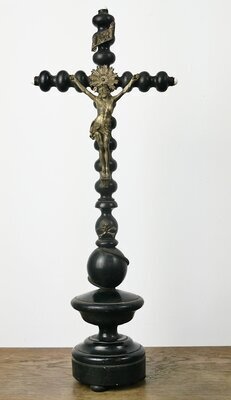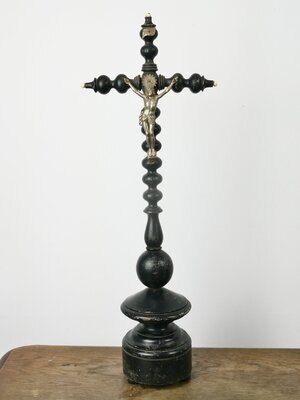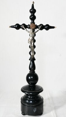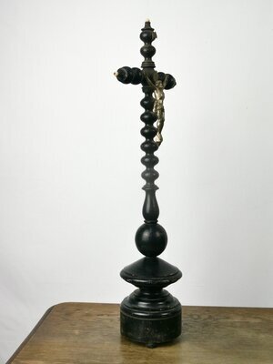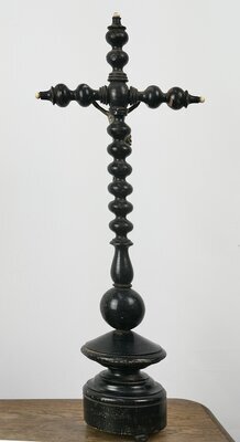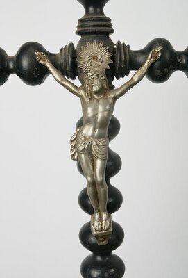 Gedrechseltes schwarzes Standkreuz (Kruzifix) . Das Kreuz besteht aus braunem, schwarz lackiertem Holz. Sowohl der Quer- als auch der Längsbalken mit wuchtigem Fuß sind aus einem Stück gedrechselt. Der silbrige, relativ kleinen Korpus ist aus versilbertem (?) Metallguss. Die Arme sind schräg nach oben ausgestreckt. Der Korpus ist mit 2 Nägeln durch die nach oben gestreckten Hände am Querbalken befestigt. Die Füße stehen auf einer Konsole, die wiederum am Stamm des Kreuzes befestigt ist. Oberhalb des Kopfes befindet sich als Titulus crucis eine geschwungenen INRI-Tafel. Über dem Kopf Christi befindet sich ein strahlenförmiger Nimbus (Heiligenschein). Oben am Längsbalken und an beiden Enden des Querbalkens befinden sich kleine Kugeln aus Elfenbein. Die gedrechselten und schwarz lackierten Holzkreuze fanden wohl vor allem bei der häuslichen Totenaufbahrung Verwendung. Wir bedanken uns ganz herzliche beim Museums am Dom in Trier für die Informationen zur Herstellung und Verwendung dieser Kreuze.