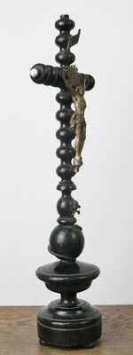 Gedrechseltes schwarzes Standkreuz (Kruzifix) . Das Kreuz besteht aus braunem, schwarz lackiertem Holz. Sowohl der Quer- als auch der Längsbalken mit wuchtigem Fuß sind aus einem Stück gedrechselt. Die Arme des Korpus sind schräg nach oben ausgestreckt. Der Korpus ist mit 2 Nägeln durch die nach oben gestreckten Hände am Querbalken befestigt. Die Füße stehen auf einer Konsole, die wiederum am Stamm des Kreuzes befestigt ist. Oberhalb des Kopfes befindet sich als Titulus eine geschwungene INRI-Tafel. Über dem Kopf Christi befindet sich ein strahlenförmiger Nimbus (Heiligenschein) und über diesem der Titulus crucis (die INRI-Tafel). Um die oberste Kugel des Fußes windet sich eine Schlange und das Element darüber ziert ein Adamsschädel (Totenkopf). Oben am Längsbalken und an beiden Enden des Querbalkens befinden sich kleine Kugeln aus Elfenbein. Die gedrechselten und schwarz lackierten Holzkreuze fanden wohl vor allem bei der häuslichen Totenaufbahrung Verwendung. Wir bedanken uns ganz herzliche beim Museums am Dom in Trier für die Informationen zur Herstellung und Verwendung dieser Kreuze.