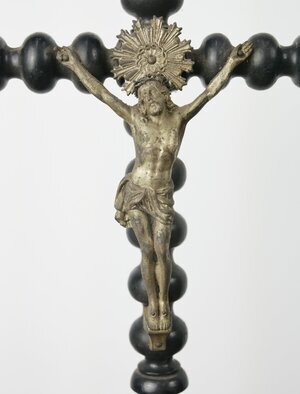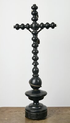 Gedrechseltes schwarzes Standkreuz (Kruzifix) . Das Kreuz besteht aus braunem, schwarz lackiertem Holz. Sowohl der Quer- als auch der Längsbalken mit wuchtigem Fuß sind aus einem Stück gedrechselt. Die Arme des Korpus sind schräg nach oben ausgestreckt. Der Korpus ist mit 2 Nägeln durch die nach oben gestreckten Hände am Querbalken befestigt. Die Füße stehen auf einer Konsole, die wiederum am Stamm des Kreuzes befestigt ist. Oberhalb des Kopfes befindet sich als Titulus eine geschwungene INRI-Tafel. Über dem Kopf Christi befindet sich ein strahlenförmiger Nimbus (Heiligenschein) und über diesem der Titulus crucis (die INRI-Tafel). Um die oberste Kugel des Fußes windet sich eine Schlange und das Element darüber ziert ein Adamsschädel (Totenkopf). Oben am Längsbalken und an beiden Enden des Querbalkens befinden sich kleine Kugeln aus Elfenbein. Die gedrechselten und schwarz lackierten Holzkreuze fanden wohl vor allem bei der häuslichen Totenaufbahrung Verwendung. Wir bedanken uns ganz herzliche beim Museums am Dom in Trier für die Informationen zur Herstellung und Verwendung dieser Kreuze.