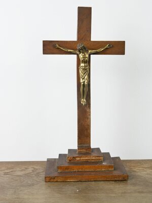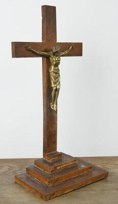 Sehr einfaches Standkreuz aus Holz. Getreppter Sockel mit 4 Treppen. Korpus aus vermessingtem Metall. Deutlicher Abrieb oben am Kopf. Der Korpus ist mit je einem Nagel durch die Hände und mit einem Nagel durch den rechten Fuß am Holz befestigt.