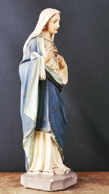 Gipsstatue mit der Darstellung des unbefleckten Herzens Marias. Die Statue steht auf einem Sockel. Sie trägt ein Kopftuch, eine weiße Tunika und über dieser ein Tuch in blauer Farbe mit goldenen Sternen. Auf ihrer Brust ist ein goldenes, brennendes Herz im Strahlenkranz. Es ist analog zu Darstellungen des heiligsten Herzens Jesu, mit einem Kranz weißer Rosen umwunden. Die Rosen symbolisieren die Jungfräulichkeit und Reinheit Mariens. Unten auf der Rückseite der Statue befindet sich unten die Inschrift: Eig J. St. 1923 Nr 107 Die Statue zeigt eine Reihe von Abplatzungen, ist aber ansonsten in einem relativ guten Zustand. Die Herz-Mariä-Verehrung richtet sich auf Maria, die Mutter Jesu, als Person, die sich Gott und den Menschen widmete und dem Heilswerk ihres Sohnes unterordnete. Die Herz-Maria-Verehrung geht bis auf die Kirchenväter zurück und kam insbesondere im 17. und im 19. Jahrhundert zusammen mit der Verehrung des Herzen Jesu zur Blüte.