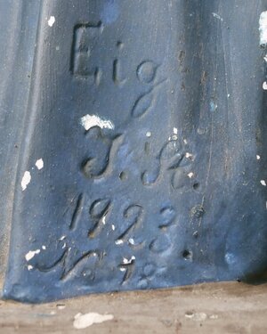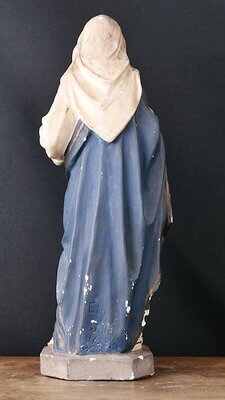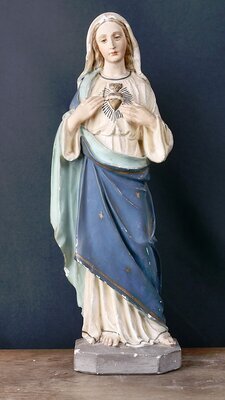 Gipsstatue mit der Darstellung des unbefleckten Herzens Marias. Die Statue steht auf einem Sockel. Sie trägt ein Kopftuch, eine weiße Tunika und über dieser ein Tuch in blauer Farbe mit goldenen Sternen. Auf ihrer Brust ist ein goldenes, brennendes Herz im Strahlenkranz. Es ist analog zu Darstellungen des heiligsten Herzens Jesu, mit einem Kranz weißer Rosen umwunden. Die Rosen symbolisieren die Jungfräulichkeit und Reinheit Mariens. Unten auf der Rückseite der Statue befindet sich unten die Inschrift: Eig J. St. 1923 Nr 107 Die Statue zeigt eine Reihe von Abplatzungen, ist aber ansonsten in einem relativ guten Zustand. Die Herz-Mariä-Verehrung richtet sich auf Maria, die Mutter Jesu, als Person, die sich Gott und den Menschen widmete und dem Heilswerk ihres Sohnes unterordnete. Die Herz-Maria-Verehrung geht bis auf die Kirchenväter zurück und kam insbesondere im 17. und im 19. Jahrhundert zusammen mit der Verehrung des Herzen Jesu zur Blüte.