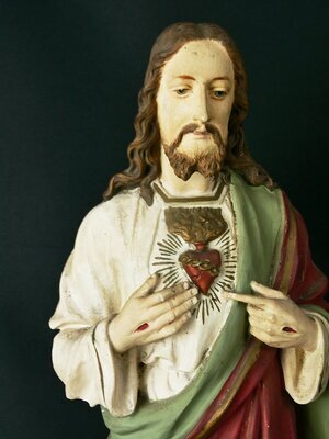 Die Verehrung des Heiligsten Herzens Jesu ist eine Ausdrucksform der römisch-katholischen Spiritualität. Dabei wird das durchbohrte Herz des Gekreuzigten als Quelle der Sakramente der Kirche verehrt. Die Jesusstatue steht auf einem Sockel. Christus ist mit langem gewellten Haar und Bärten dargestellt. Er trägt eine Tunika und darüber ein rotes Tuch mit goldenem Randstreifen und grüner Rückseite. Christus zeigt Wundmale an Händen und Füßen. Auf seiner Brust befindet sich ein rotes, golden brennendes Herz in einem Strahlenkranz. Quer über das Herz läuft ein goldenes Ornament (die stilisierte Dornenkrone?). Die Verehrung des Herzen Jesus geht bis auf das frühe Mittelalter zurück. Die neuzeitliche Verehrung des Herzen Jesu gründet sich auf den vier Visionen der französischen Ordensfrau Margareta Maria Alacoque zwischen dem 27. Dezember 1673 und 1675 zurück. Einen Höhepunkt fand die Verehrung in der zweiten Hälfte des 19. und am Anfang des 20. Jahrhunderts. In diesem Zeitraum entwickelte sich der heute verbreitetste ikonographische Typus, der Jesus mit sichtbarem Herzen zeigt, meist mit Segensgestus oder indem er auf das Herz weist.
