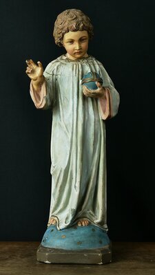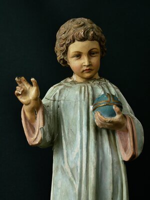 Segnendes Jesuskind auf einer Sternenkuppel welche wiederum auf einem Sockel steht. Das Jesuskind mit lockigem Haar trägt eine hellblaue Tunika und hält in der linken Hand eine Weltkugel und segnet mit der rechten Hand. An der Rückseite findet sich das Firmenlogo (des Herstellers) mit den Buchstaben KSKW. Das Objekt ist stark beschädigt. Der Kopf ist mehrfach abgebrochen und wurde dilettantisch viel zu weit nach vorne geneigt wieder angeklebt.