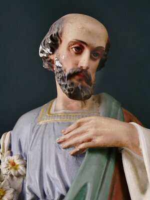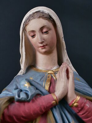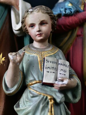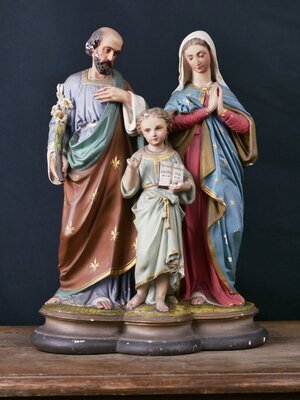 Die Figurengruppe stellt Josef, Maria und den etwa 8-jährigen Jesus dar. Jede Figur steht auf einem Sockel. Diese 3 Sockel sind miteinander verbunden. Josef trägt Bart und hat schütternes Haar. Mit der linken Hand fasst er sich an sein Herz, in der rechten Hand trägt er einen Stängel mit Lilienblüten. Die Lilie in der Hand von Josef weist auf dessen Reinheit und Unschuld im Zusammenhang mit der Geburt Jesu hin. Er trägt eine hellblaue Tunika und darüber ein braunes Tuch. Dieses besitzt eine goldene Einfassung und die goldenen Lilien des Wappens der französischen Könige. Die königlichen Liliensymbole auf dem Mantel deuten auf die "königliche Herkunft" Josefs aus dem Geschlecht König Davids hin. Maria faltet die Hände zum Gebet und trägt ein rotes Gewand. Der darüberliegende Mantel ist blau und mit goldenen Sternen. Diese sind ein Symbol für "Stella maris" (Meerstern) den Stern, der der einzelnen Seele auf dem „Meer des Lebens“ die Richtung weist. Das Jesuskind segnet mit der (etwas beschädigten) rechten Hand und hält in der linken Hand ein Buch auf dem der Schriftzug "Si vous mai mez imitez moi" in Deutsche übersetzt "Wenn du mich liebst, ahme mich nach" zu sehen ist. Aufgrund des französischsprachigen Textes auf dem Buch des Jesuskinds und der königlichen Lilien auf dem Überwurf von Josef kann eine Herkunft aus Frankreich angenommen werden. Da Karl X., der letzte französische König, der das Lilienwappen führte, bereits 1830 abdankte und die Figur um 1900 hergestellt wurde, sind diese Lilien als allgemeines Symbol für die königllche Herkunft Josefs aus dem Hause Davids zu betrachten. Die Verehrung der Heiligen Familie ist seit dem Mittelalter nachweisbar. In der katholischen Tradition begann die Verehrung der Heiligen Familie in der gegenreformatorischen Barockzeit. Sie nahm ab der Mitte des 19. Jahrhunderts nochmals einen Aufschwung, der bis in die ersten Jahrzehnte des 20. Jahrhunderts reichte. Man sah in dem 30 Jahre währenden Leben Jesu in der Heiligen Familie ein bedeutungstiefes Mysterium und ein hilfreiches Vorbild für das vielfach gefährdete Familienleben. Wir bedanken uns ganz herzliche beim Museum am Dom in Trier für die Unterstützung bei der Entschlüsselung der auf den Figuren dargestellten Symbolik.