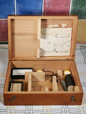 Es handelt sich um eine Mohr- Westphahlsche Waage zur Bestimmung der Dichte von Flüssigkeiten. Die Punzierung mit der zweischaligen Waage zeigt das 1960-1961 verwendete Firmenlogo. Die Waage ist nicht vollständig erhalten. Es fehlt der Senkkörper und dessen Aufhängung am Ende des Waagebalkens. Es sind viele größere Gewichte vorhanden, aber relativ sehr wenige kleine Gewichte. Funktionsweise der Waage: Der statische Auftrieb, den ein Körper erfährt, der in die Flüssigkeit eingetaucht wird, ist proportional zur Masse der verdrängten Flüssigkeitsmenge. Daraus kann bei bekanntem Volumen des Körpers auf die Dichte der Flüssigkeit geschlossen werden (Archimedisches Prinzip). Die Waage ist so konstruiert und kalibriert, dass die Dichte der Flüssigkeit direkt dezimal abgelesen werden kann. Die Konstruktion der Waage: Die Waage besteht aus einem Fuß und einem Ständer. Mit der Schraube am Fuß kann die Waage kalibriert werden. Auf dem Ständer ist ein Band aus Messing befestigt, das links in einer vertikalen Biegung ausläuft. In der Mitte der Biegung und auf Höhe der Mitte des Waagebalkens ist eine Metallspitze angebracht. Das "Mittelgelenk" des Waagebalkens ist am rechten Ende des Bandes auf diesem befestigt. Den rechten Teil des Waagebalkens teilen Kerben in 10 gleiche Teile. Statt der 10. Kerbe ist ein Haken angebracht , der an einem feinen Platindraht den Senkkörper mit Thermometer aufnimmt. Das Ende des linken Teils des Waagebalkens trägt ein Gegengewicht mit Dorn. Sind der Dorn und die Metallspitze auf gleicher Höhe, so ist die Waage im Gleichgewicht. Der Senkkörper befindet sich in einem Standzylinder, der zur Kalibrierung der Waage mit 4° warmen destilliertem Wasser gefüllt wird . Zur Waage gehören auch sechs Reiter. Die beiden großen haben eine identische Größe (und Gewicht). Die kleinen haben 1/10 bzw. 1/100 des Gewichts der großen Reiter. Der Senkkörper wird in das mit Flüssigkeit gefüllte Glas abgelassen und erfährt in einer Flüssigkeit einen Auftrieb. Dieser wird durch kleine Hakengewichte, die in die Kerben des Balkens eingehängt werden, ausgeglichen bis die Waage sich im Gleichgewicht befindet. Aus der Größe und der Lage der Hakengewichte kann nun der Dichtewert der Flüssigkeit bestimmt werden. Der Wiegevorgang: Der am Waagebalken hängende Senkkörper wird in das 4° warme Wasser getaucht. Um den Auftrieb durch das Wasser auszugleichen wird der große Reiter an den Haken des rechten Waagebalkens gehängt. Die Waage ist nun wieder im Gleichgewicht. Falls noch nicht kann mit der Stellschraube am Fuß der Waage nachjustiert werden. Das Gewicht des großen Reiters ist dabei gleich des Gewichts des der vom Senkkörper verdrängten Wassermenge, dessen Dichte definitionsgemäß 1 sein soll. Füllt man den Standzylinder nun anstatt mit dem Destilliertem Wasser mit einer Flüssigkeit der Dichte 2, so erfährt der Tauchkörper den doppelten Auftrieb, weil die verdrängte Flüssigkeitsmenge doppelt so schwer ist. Hängt man den zweiten großen Reiter an den Haken, so ist die Waage wieder im Gleichgewicht. Allgemein: Ist die Dichte über 1, so bleibt der erste große Reiter am Haken. Je ein großer, mittlerer und kleiner Reiter werden so in die Kerben eingehängt, bis die Waage im Gleichgewicht ist. Die Dichte der Flüssigkeit kann dann direkt abgelesen werden und ist dann 1,xxx. Der zweite große Reiter liefert dabei die erste Dezimale der Dichte, der mittlere die zweite und der kleine die dritte Dezimale. Ist die Dichte der Flüssigkeit unter 1, dann wird der erste große Reiter entfernt und die anderen 3 Reiter werden in die Kerben gehängt bis die Waage sich im Gleichgewicht befindet. Die Dichte ist dann 0,xxx . Epilog: Zu finden waren diese „Waagen“ zumeist in Apotheken. Bei entsprechender Verwendung fällt sie heute auch noch unter das Eichwesen. Die Mohr-Westfalen-Waagen befinden sich heute extrem selten in der Anwendung, da die Dichtebestimmung mit der Waage eine gewisse Erfahrung mit deren Handling benötigt. Sie wurde heute überwiegend durch elektronische Dichtemessgeräte ersetzt die einfacher zu bedienen sind.