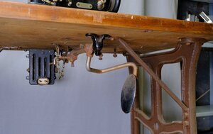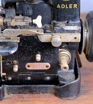 Unsere Adlermaschine mit der Typen Nummer 81 – 6 ist eine Dreifädige Overlock (Überwendling) -Nähmaschine. Die zusätzliche Ziffer 6 sagt aus, dass sie sich besonders eignet, um leichte und mittelschwere Stoffe zu bearbeiten. Die Maschine verfügt über einen ab klappbaren Saumapparat, Abschneide Vorrichtung und Differentialtransportierung. Leider fehlt der komplette Garnhalter. Der Antrieb erfolgt über einen 220 V Elektromotor (400 W), der unterhalb des Tisches angeordnet ist und über das Fußpedal gesteuert wird. Mit ihm lassen sich 4000 Stiche/Min erzielen, was einer Nähleitung von ca. 6,5 m/Min entspricht. Die Produktion der Maschine (Fabriknummer 9272), kann auf die Jahre 1940 -1950 eingegrenzt werden. Der Unterbau samt der Tischplatte stammt nicht von Adler, sondern von der Firma Kochan, einem großen Nähmaschinen Händler, aus Göppingen. Eine Metallplakette der Firma ist auf der Tischplatte eingelassen. Auch in die Tretplatte wurde beim Guss der Name „Kochan Göppingen“ eingearbeitet. Für diese Maschine ist eine Original Anleitung erhalten geblieben, sowie eine Werkzeugbox mit Zubehörteilen. (siehe Link)
