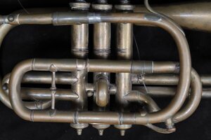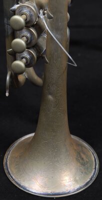 B-Piston, Fabrikat Schuster & Co., Markneukirchen Gravur: "Sächs. Musikinstr. Manufaktur Schuster & Co. Markneukirchen" Die Instrumentenmanufaktur Schuster & Co. wurde 1580 in Markneukirchen gegründet und ist damit einer der ältesten nachweisbaren Instrumentenhersteller in Europa. Seit dem 17. und 18. Jahrhundert wurden neben Saiten- auch Blasinstrumente hergestellt. Das B-Piston stammt wahrscheinliche aus der Zeit nach 1862, nachdem Ludwig Schuster eine neue Fabrik in Markneukirchen gründete, in welcher, nach der Entwicklung neuer Ventilmechanik, vor allem Blechblasinstrumente hergestellt wurden. Auf dem Piston ist nicht nur der Markenname Schuster & Co. eingraviert. Die Verzierung mit Eichenlaub und und dem Herstellersiegel erstreckt sich über gesamten Schalltrichter und den letzten konischen Teil des Rohres bis zur ersten Krümmung auf Höhe der Ventile. Der Stil der Gravur ähnelt den im Jugendstil üblichen Verzierungen, was die Herstellung des B-Pistons zwischen 1890-1910 wahrscheinlich macht.