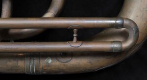 Es-Tuba, Fabrikat Lehnert Philadelphia Henry Lehnert war ein deutscher Instrumentenbauer, geboren 1838 in Freiberg, der sich zuerst ab 1861 in Boston, Massachusetts niederließ und später, um 1867 nach Philadelphia, Pennsylvania umzog. In Philadelphia war Henry Lehnert von 1867 bis zu seinem Tod 1916 als Instrumentenbauer tätig. Eine Gravur ist durch die Gebrauchsspuren nicht mehr zu erkennen, was eine Entstehungszeit zwischen 1870 und 1880 wahrscheinlich macht. Nach 1880 wurde die Gravur auf Instrumenten von Henry Lehnert größer und detailreicher - dadurch wären noch Spuren der Gravur erkennbar.