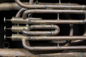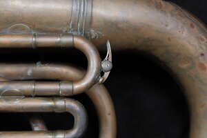 Es-Tuba, Fabrikat Lehnert Philadelphia Henry Lehnert war ein deutscher Instrumentenbauer, geboren 1838 in Freiberg, der sich zuerst ab 1861 in Boston, Massachusetts niederließ und später, um 1867 nach Philadelphia, Pennsylvania umzog. In Philadelphia war Henry Lehnert von 1867 bis zu seinem Tod 1916 als Instrumentenbauer tätig. Eine Gravur ist durch die Gebrauchsspuren nicht mehr zu erkennen, was eine Entstehungszeit zwischen 1870 und 1880 wahrscheinlich macht. Nach 1880 wurde die Gravur auf Instrumenten von Henry Lehnert größer und detailreicher - dadurch wären noch Spuren der Gravur erkennbar.
